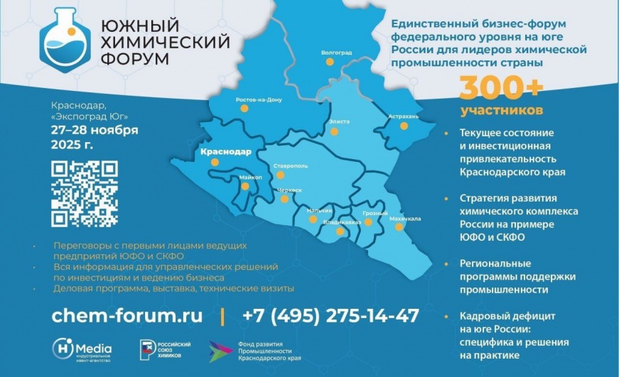 Более 400 предприятий примут участие в первом Южном химическом форуме в КраснодареМероприятия 27 и 28 ноября объединят участников из Южного и Северо-Кавказского федеральных округов. Это единственная на юге России бизнес-площадка федерального уровня для лидеров химической промышленности.